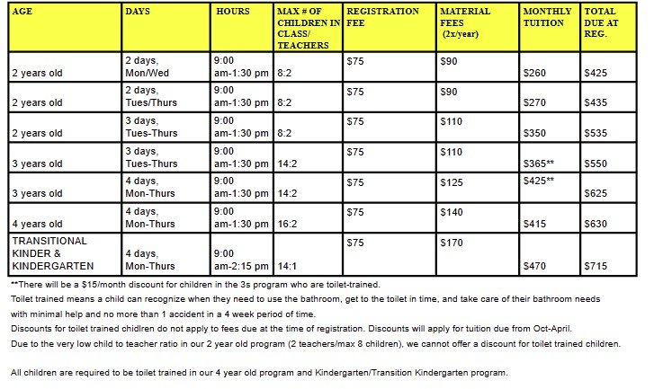 All registration fees are completely nonrefundable. A $10 discount per month is given to each additional sibling in the same family. The discount does not apply to the registration tuition retainer. There will be a $15/month discount for children in the 3s program who are toilet-trained. Toilet trained means a child can recognize when they need to use the bathroom, get to the toilet in time, and take care of their bathroom needs with minimal help and no more than 1 accident in a 4-week period of time. Discounts for toilet trained children do not apply to fees due at the time of registration. Discounts will apply for tuition due from Oct-April. Due to the very low child to teacher ratio in our 2-year-old program (2 teachers/max 8 children), we cannot offer a discount for toilet trained children in this program. Children in our 4-year-old program and Kindergarten/Transition Kindergarten program are required to be toilet trained.
